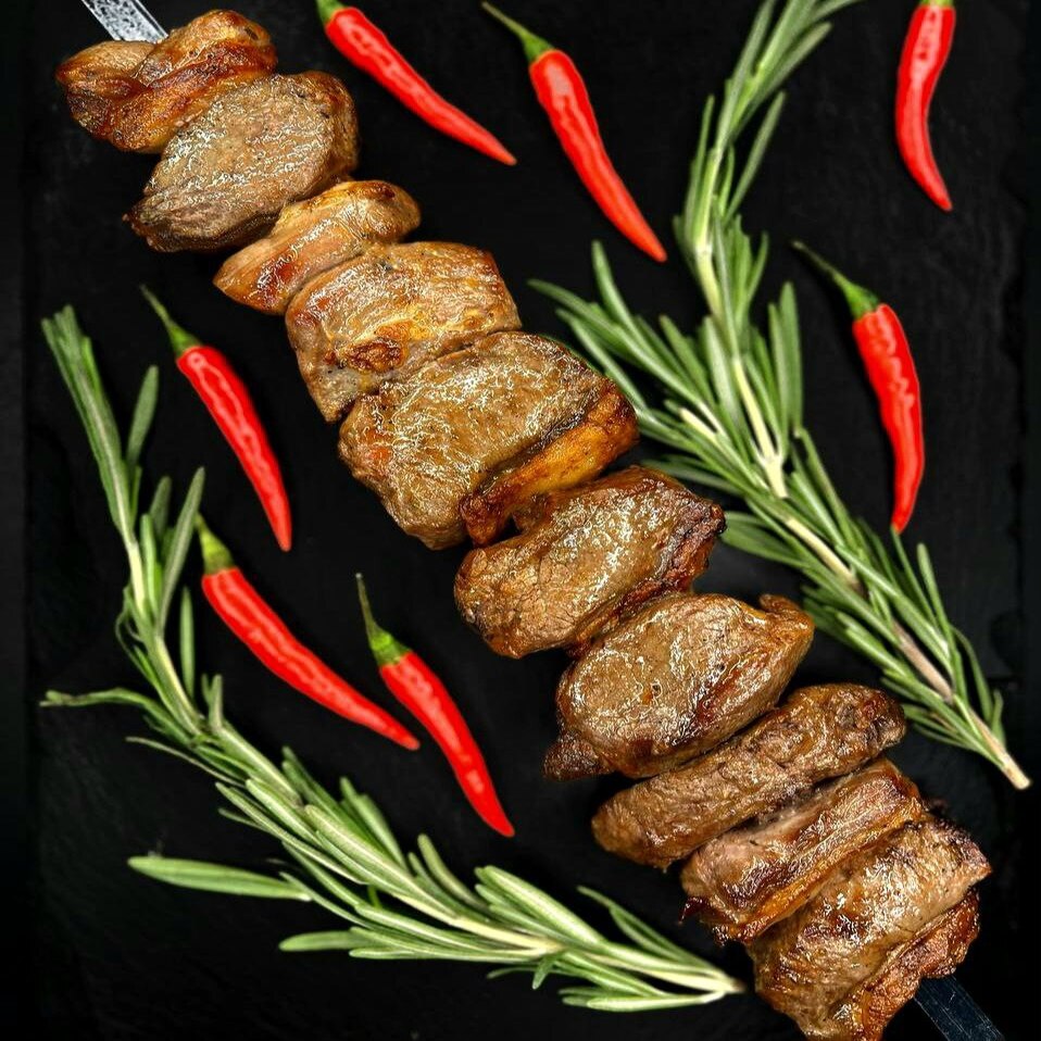 Баранина спинная часть, соль, перец черный, паприка и секрет повара.
